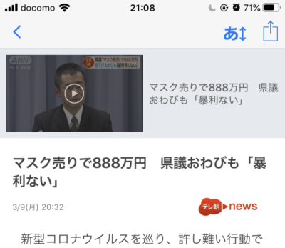 ただ、この新型コロナウィルス問題の中で、静岡県を考える県議会議員が、この時期にマスクをインターネットオークションに出展するというのは、行為としていただけないと思いました。