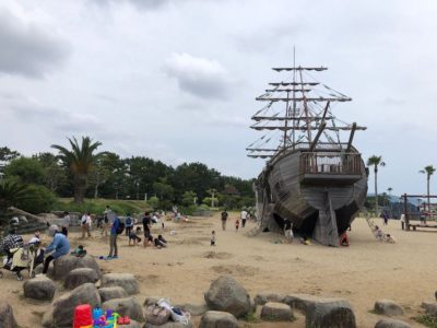 静岡市の用宗港近くに沈没船のような海賊船のような、大きな難破船が海岸近くの砂浜に埋まっている公園があります。公園ですので、無料ですし、駐車場も無料でたくさん(200台くらい)あります。