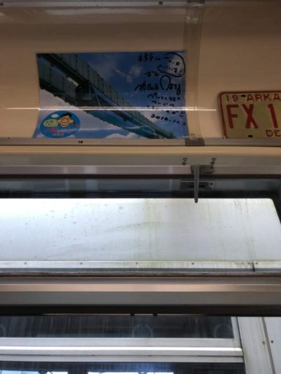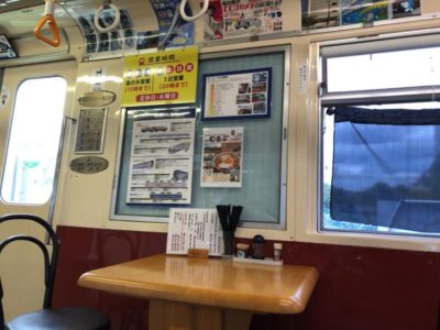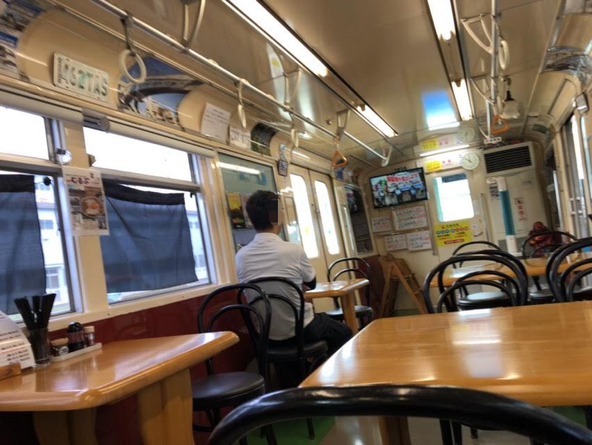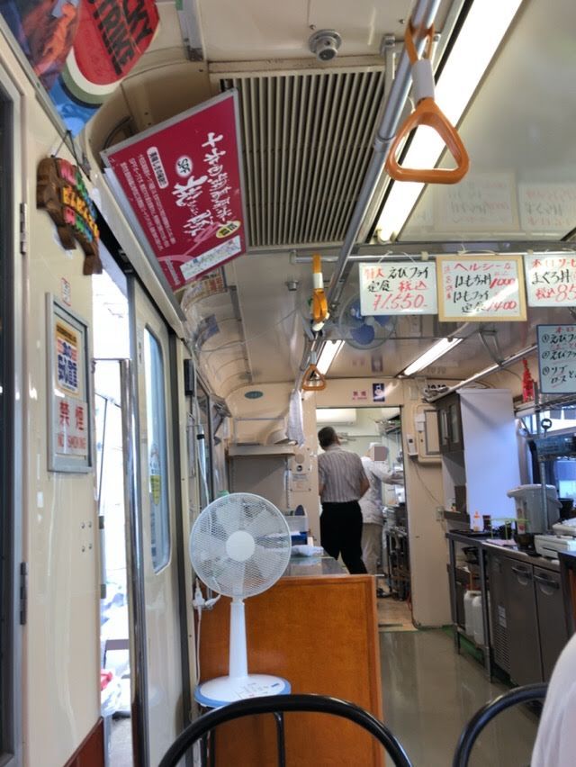 店内は、電車そのもの。手すりの吊り輪とかもそのままで。