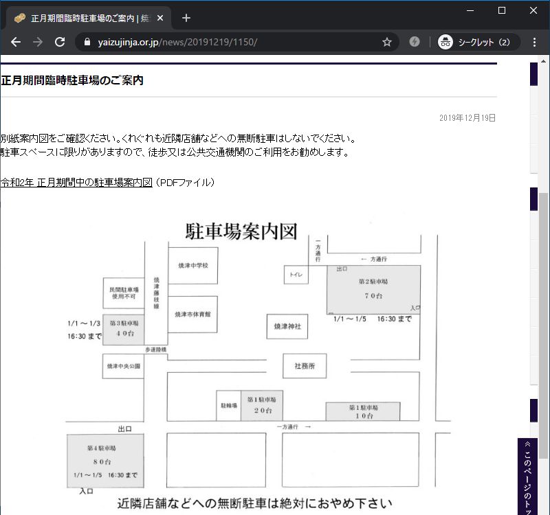 ただし、臨時駐車場は1/1~1/5 16:30まででした。