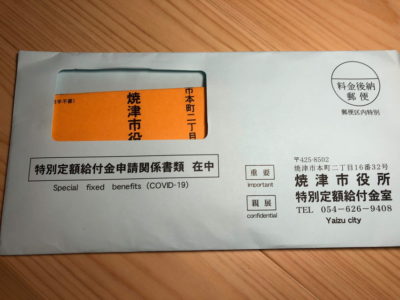 特別定額給付金申請書が焼津市から郵送で届きました。返信用封筒もありました。