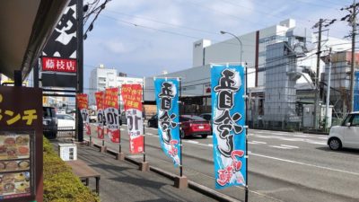 コロナ禍になりまして、久しぶりに藤枝市の五味八珍に行きましたところ、興味深い張り紙と旗をみました。