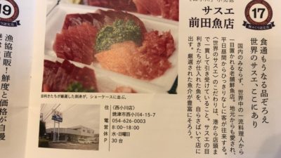 最終記事更新日: 2020年11月4日 2017年4月にテレビ「静岡発そこ知り」で放送された焼津の魚屋「サスエ前田魚店」に行ってきました。焼津市では老舗の魚屋さん(60年)のようですね。 そもそも魚屋に行くことがほとんど … 続きを読む テレビにも出た焼津の魚屋「サスエ前田魚店」
